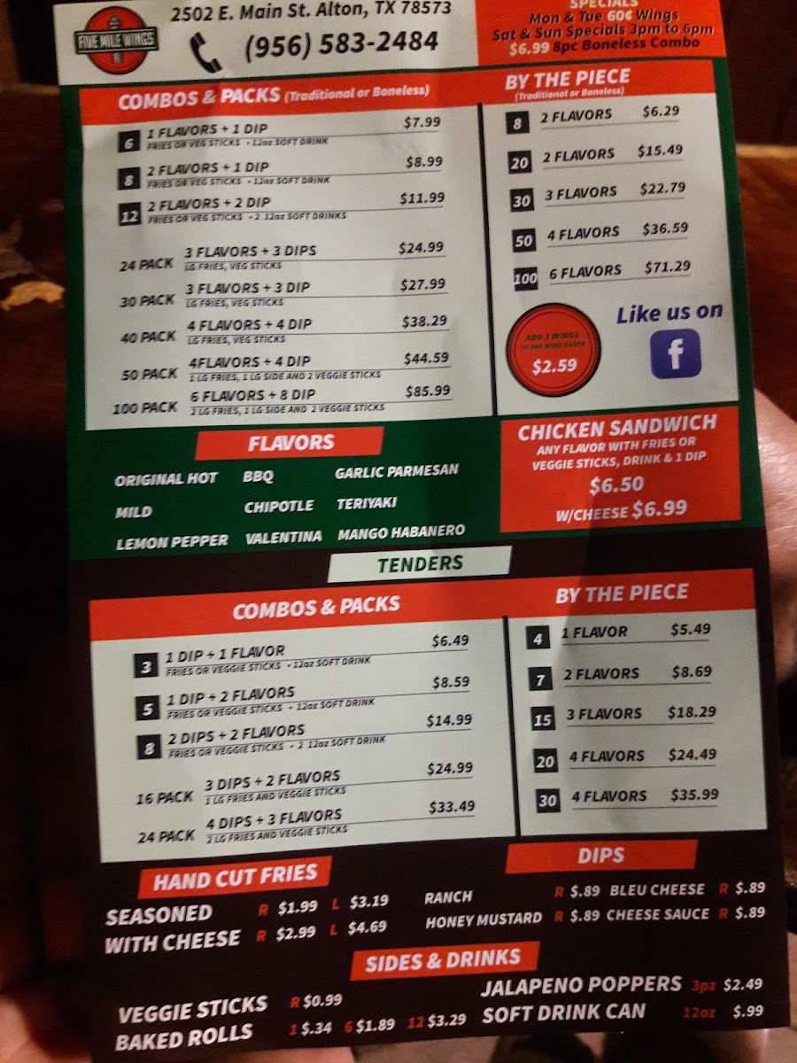 Welcome to FIVE MILE WINGS, ALTON, where flavor takes center stage at 2502 E Main Ave, Alton, TX. This cozy eatery is dedicated to crafting mouthwatering tender and wing combos that will satisfy any craving. Their menu features a range of offerings, from 4-piece tenders ($5.99) to an impressive 100-piece wings pack. Each order allows you to choose from various delectable flavors, ensuring every bite is bursting with taste.
